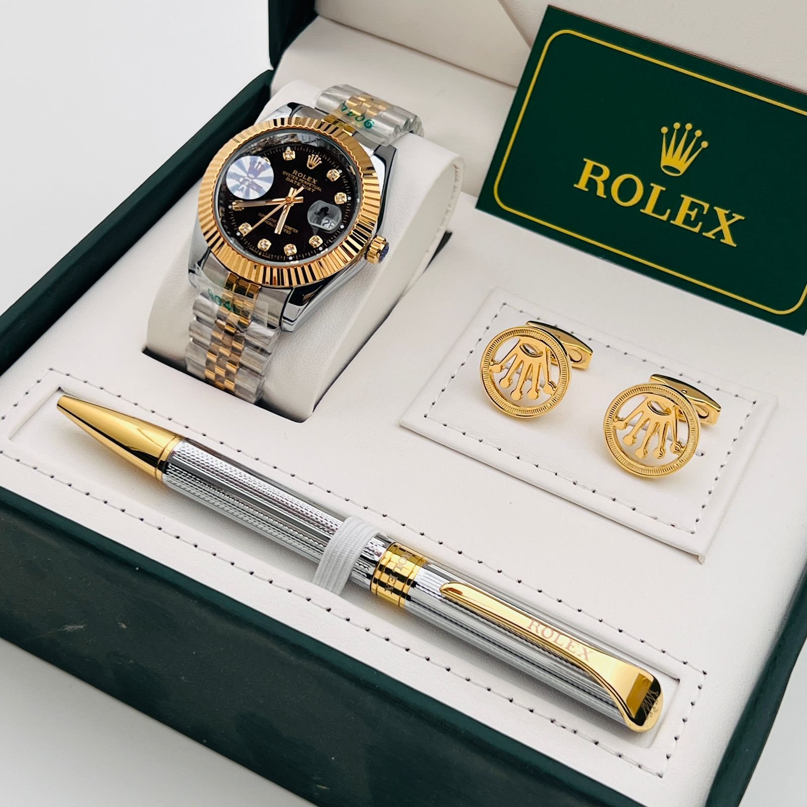 طقم رجالي رولكس ذهبي فضي بقرص أسود